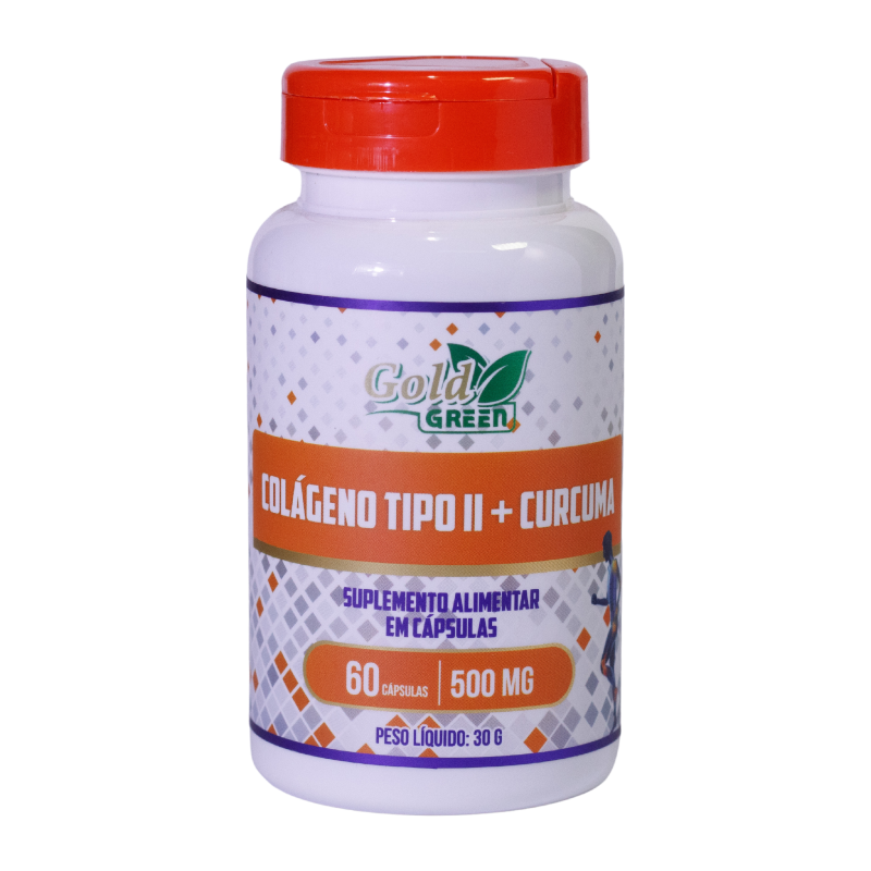 Colágeno Tipo II + Cúrcuma – Suporte nutricional para articulações. Suplemento alimentar formulado com colágeno não desnaturado tipo II e extrato de cúrcuma. O colágeno tipo II é uma proteína estrutural presente nas cartilagens, enquanto a cúrcuma é conhecida por sua composição rica em curcuminoides. Indicado para pessoas ativas e idosos que buscam manter a saúde articular com o suporte de nutrientes específicos. Benefícios do Colágeno Tipo II + Cúrcuma Gold Green: